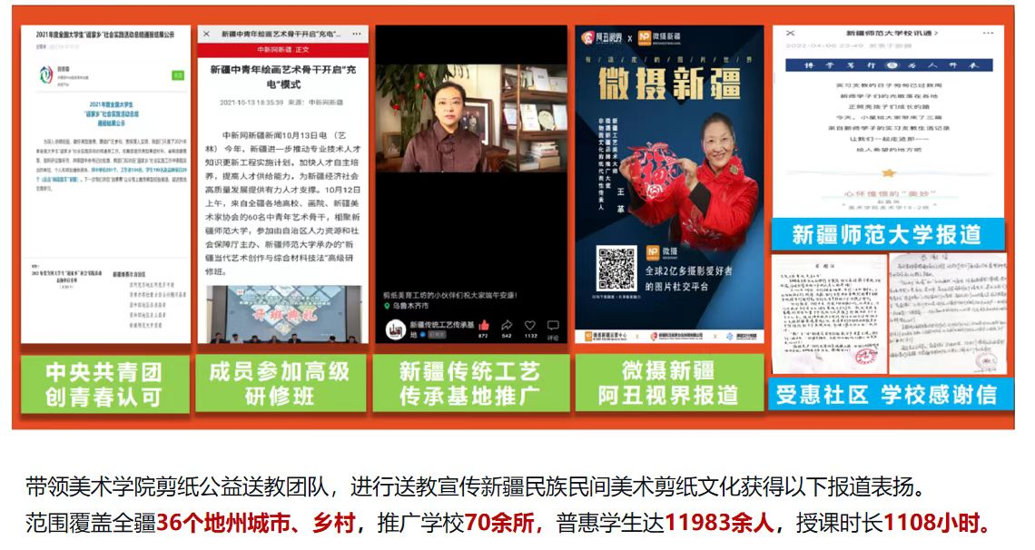 作为师范生,团支部同学积极参与教学工作,把理论知识、基本技能综合运用到实践中去,在提高专业素养的同时,认真践行师范生的责任。团支部剪纸公益送教团队,在线上推广剪纸绘画技艺。线下进行公益送教,目前已覆盖全疆36个地州、县市区和乡村推广学校70余所,普惠学生11000余人,授课时长累计1108小时。