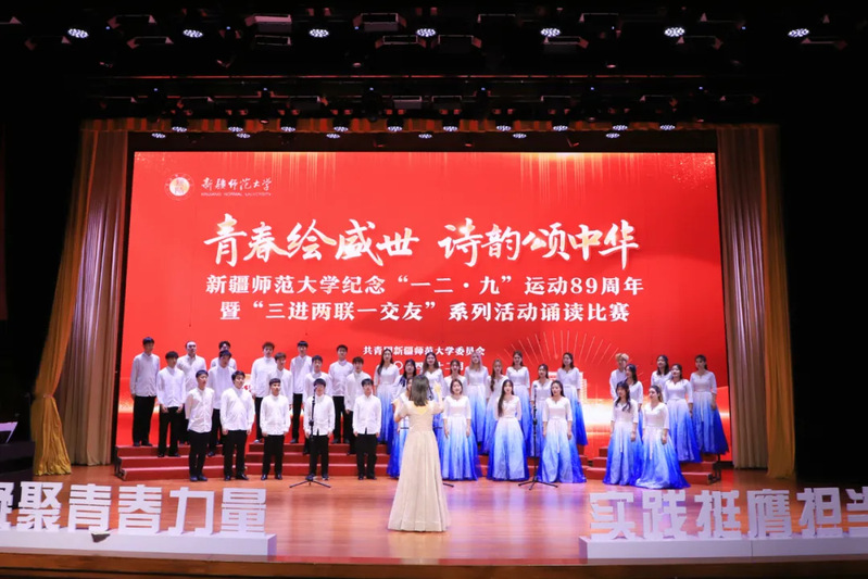 为纪念“一二·九”运动89周年,引导树立远大理想、厚植爱国情怀,增强集体凝聚力和荣誉感,充分展现我校师生的精神风貌,12月6日,我校纪念“一二·九”运动89周年暨“三进两联一交友”系列活动——“青春绘盛世,诗韵颂中华”诵读比赛在温泉校区昆仑讲堂举办。校党委副书记刘俊,校党委常委、宣传部部长高靖出席活动,我校各学院负责同志和师生代表、“银龄学者”代表以及部分参加“三进两联一交友”活动的教师共500余人参加活动。